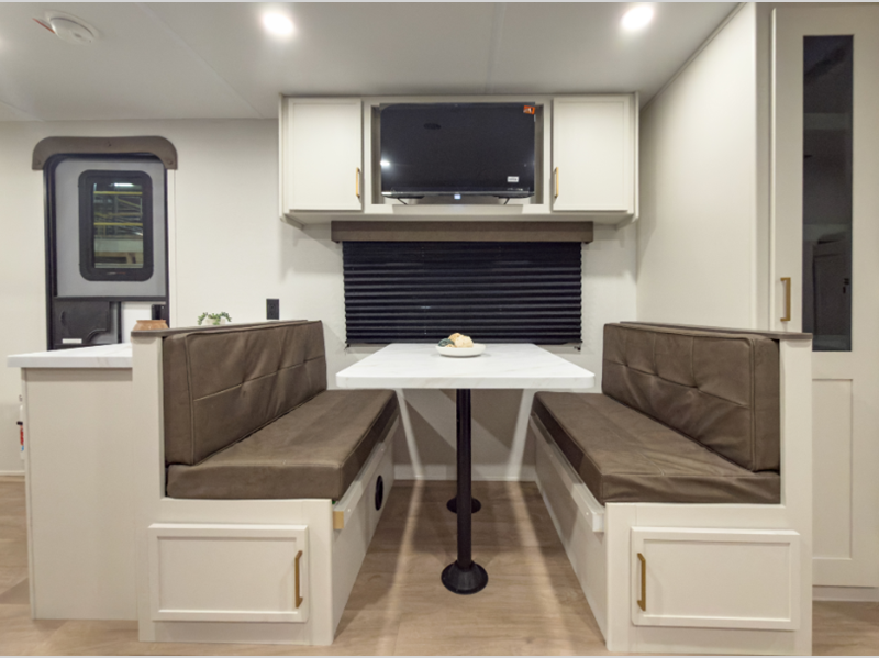 The 4-Season Protection Package includes a heated and enclosed underbelly with suspended tanks, a 35k BTU furnace, EvenFlow ductless heating throughout, and more features that help extend your camping season. There is a 6' 6" interior height to give you plenty of head room, and the thermoformed and seamless countertops in the kitchen will be easy to keep clean. You will also find many exterior conveniences, such as a universal docking station, a bottle opener and Leash Link for you furry friends, and a power tongue jack so you can easily hitch up when you're ready to go home.
